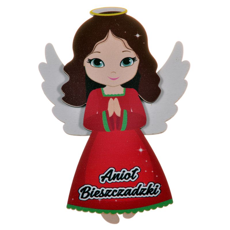 Magnes w kształcie modlącego się aniołka z czerwoną  sukienką.