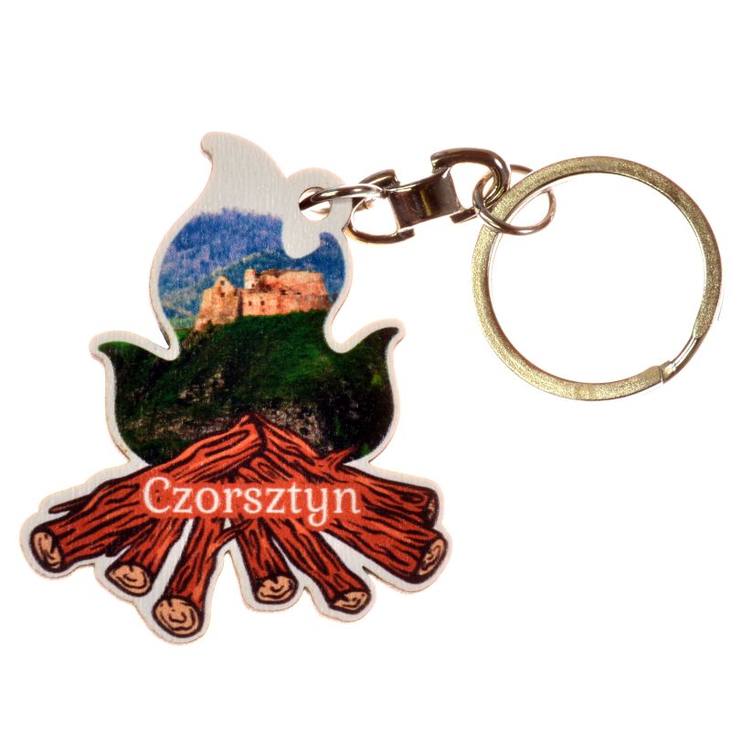 Breloczek w kształcie kształcie ogniska z grafiką namiotu nad wodą z górami w tle lub zdjęciem miejscowości.