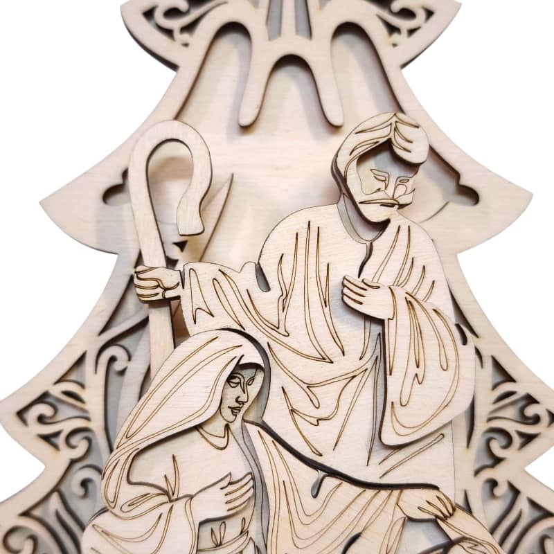 Na pierwszym planie znajduje się Święta Rodzina. Postacie Józefa i Maryi również są wielowarstwowe – składają się z dodatkowych, doklejanych elementów. Trzymają oni osobny element – małego Jezusa leżącego na sianku. Dzieło wieńczy Gwiazda Betlejemska, doklejana osobno na szczycie choinki.