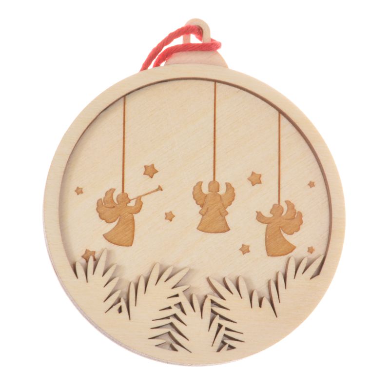 Drewniana bombka z grawerem, aniołkami i ozdobnymi gałązkami to świetny pomysł na