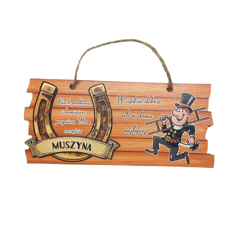Drewniana tabliczka z kominiarzem i podkową na szczeście.