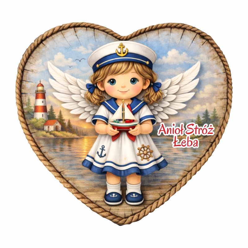 Magnes aniołek marynistyczny w kształcie serca to wyjątkowa pamiątka inspirowana klimatem jeziora i morza i motywami żeglarskimi. Urocze aniołki – dziewczynki i chłopcy – ubrane w stylu marynarskim, z delikatnymi skrzydłami, łódką, żaglami i jeziornym krajobrazem w tle, symbolizują szczęście, ochronę i dobre wspomnienia z wakacji nad wodą. Naturalna, drewniana ramka w kształcie serca nadaje całości ciepłego, rustykalnego charakteru.