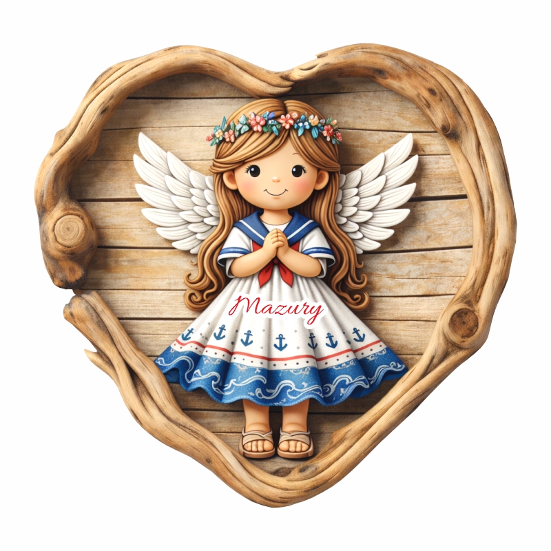 Magnes aniołek marynistyczny w kształcie serca to wyjątkowa pamiątka inspirowana klimatem jeziora i morza i motywami żeglarskimi. Urocze aniołki – dziewczynki i chłopcy – ubrane w stylu marynarskim, z delikatnymi skrzydłami, łódką, żaglami i jeziornym krajobrazem w tle, symbolizują szczęście, ochronę i dobre wspomnienia z wakacji nad wodą. Naturalna, drewniana ramka w kształcie serca nadaje całości ciepłego, rustykalnego charakteru.