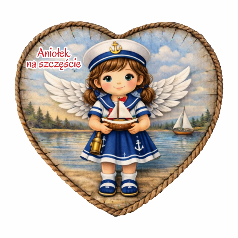 Magnes aniołek marynistyczny w kształcie serca to wyjątkowa pamiątka inspirowana klimatem jeziora i morza i motywami żeglarskimi. Urocze aniołki – dziewczynki i chłopcy – ubrane w stylu marynarskim, z delikatnymi skrzydłami, łódką, żaglami i jeziornym krajobrazem w tle, symbolizują szczęście, ochronę i dobre wspomnienia z wakacji nad wodą. Naturalna, drewniana ramka w kształcie serca nadaje całości ciepłego, rustykalnego charakteru.