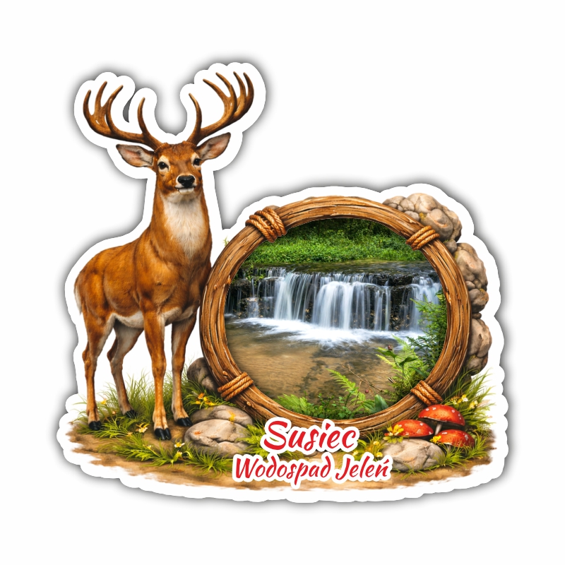 Grafika przedstawia malowniczy krajobraz umieszczony w ozdobnej, drewnianej ramie, uzupełniony realistyczną ilustracją dzikiego zwierzęcia (możemy wykonać inne zwierzę). Motywy nawiązują do gór, lasów, wodospadów oraz popularnych miejsc turystycznych takich jak magnes z Bieszczad czy magnes ze Szklarskiej Poręby, podkreślając klimat dzikiej przyrody i górskich wędrówek.