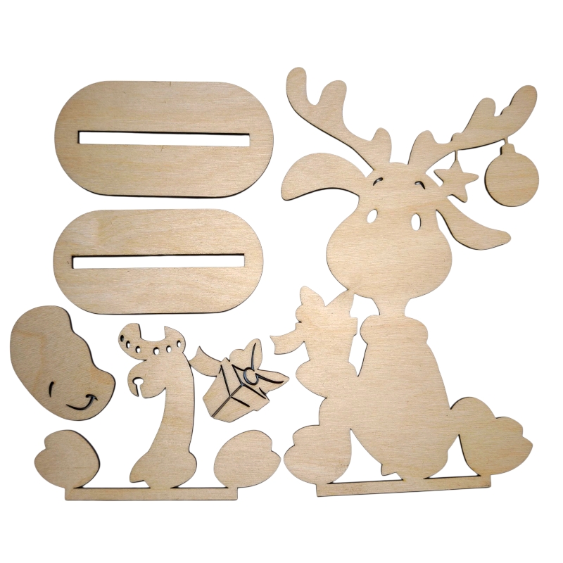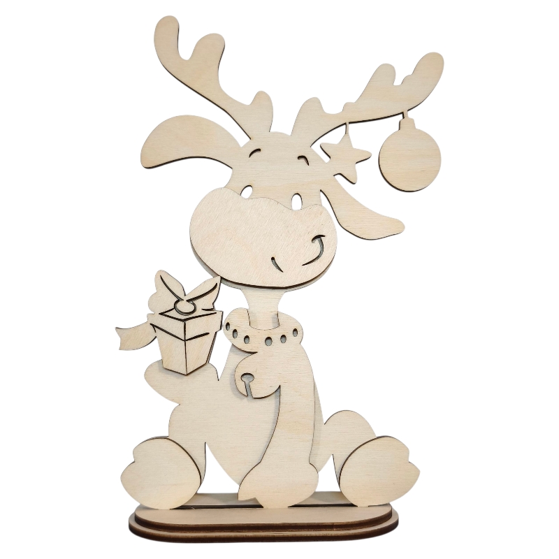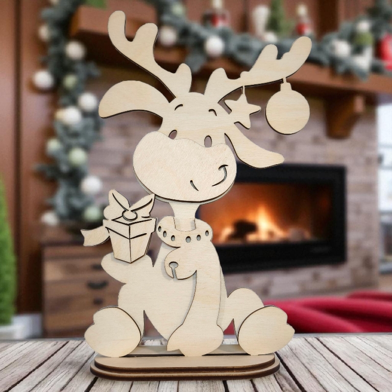 Renifer ma zabawną, sympatyczną pozę (siedzi "okrakiem"), a dzięki wielowarstwowej konstrukcji zyskuje wspaniały efekt 3D. Osobno doklejany jest wielowarstwowy pyszczek oraz duży prezent, który trzyma. Całość stoi bardzo stabilnie na solidnej, podwójnej podstawce.