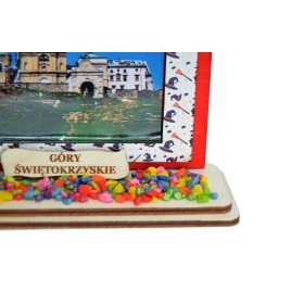 Połączenie drewna z ozdobnymi kamieniami i fotografią daje nietuzinkowy efekt. Jest to