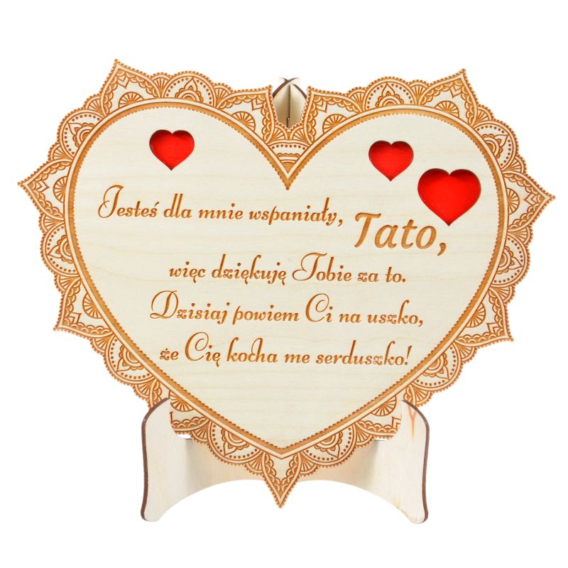 Wierszyk wygrawerowany w sercu to: "Jesteś dla mnie wspaniały Tato, więc dziękuję Tobie za to. Dzisiaj powiem Ci na uszko, że Cię kocha me serduszko!" |