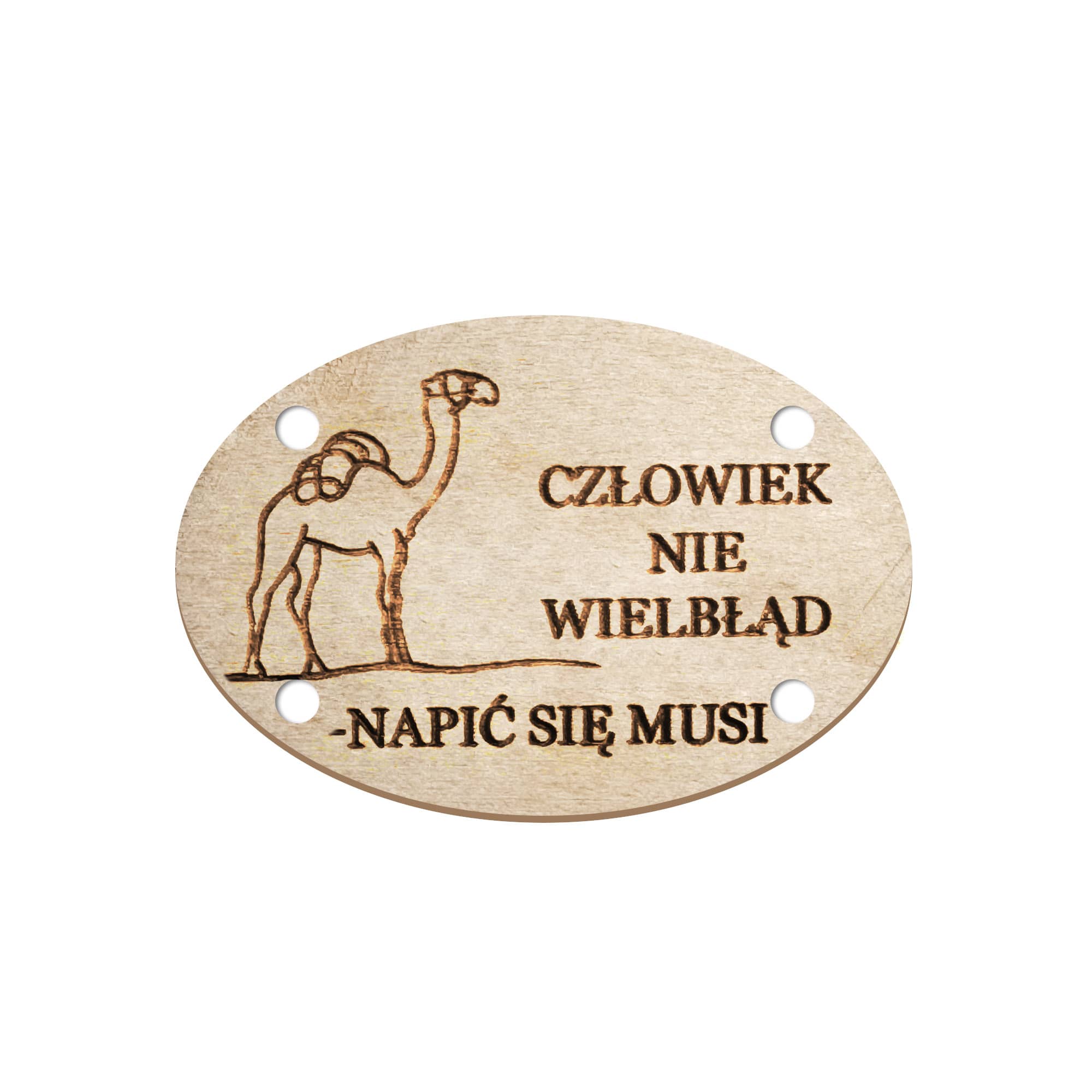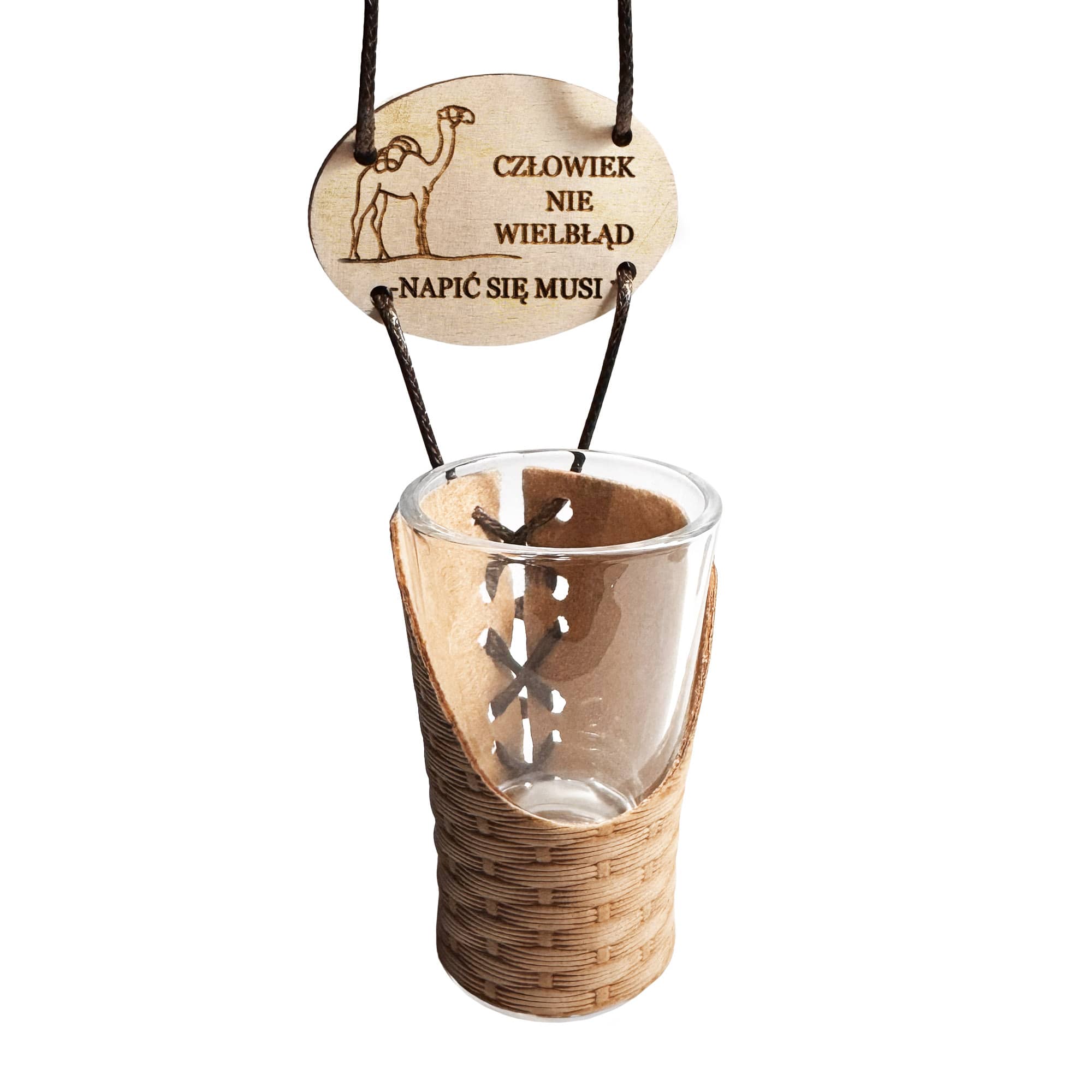 Proponowany kieliszek w skórze, jako formie etui, z jednej strony związany jest rzemykiem, do którego doczepiono tabliczkę z wizerunkiem wielbłąda i napisem: Człowiek nie wielbłąd, napić się musi”.