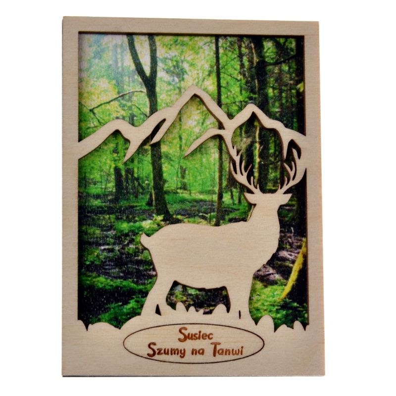 Drewniany magnes z ażurowym przodem, w który wpisany jest JELEŃ.