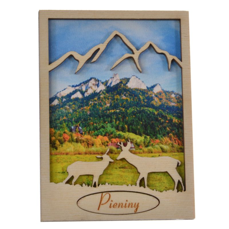 Drewniany magnes z ażurowym przodem, w który wpisany jest JELEŃ.