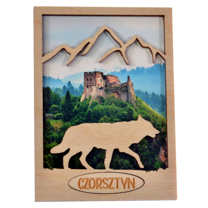 Drewniany magnes z ażurowym przodem, w który wpisany jest WILK.