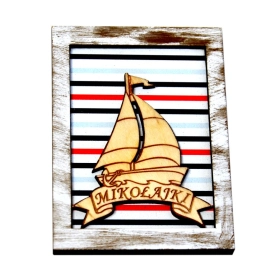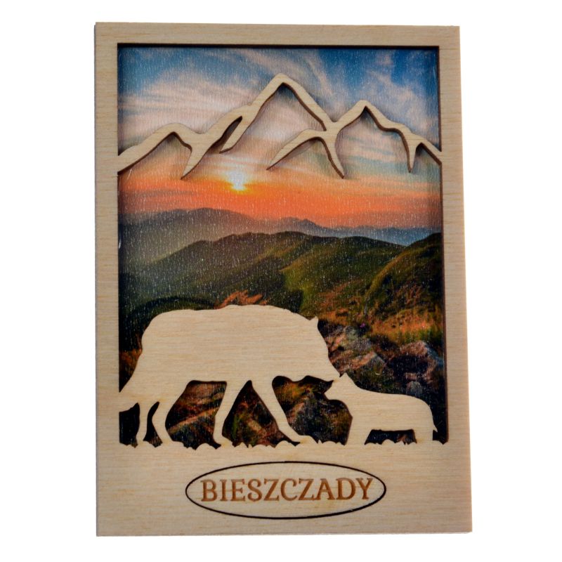 Drewniany magnes z ażurowym przodem, w który wpisany jest WILK.