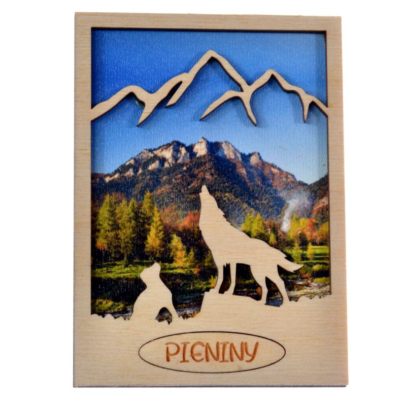 Drewniany magnes z ażurowym przodem, w który wpisany jest WILK.