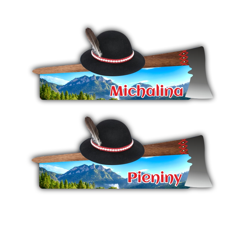 Drewniany magnes z ciupagą i widoczkiem.