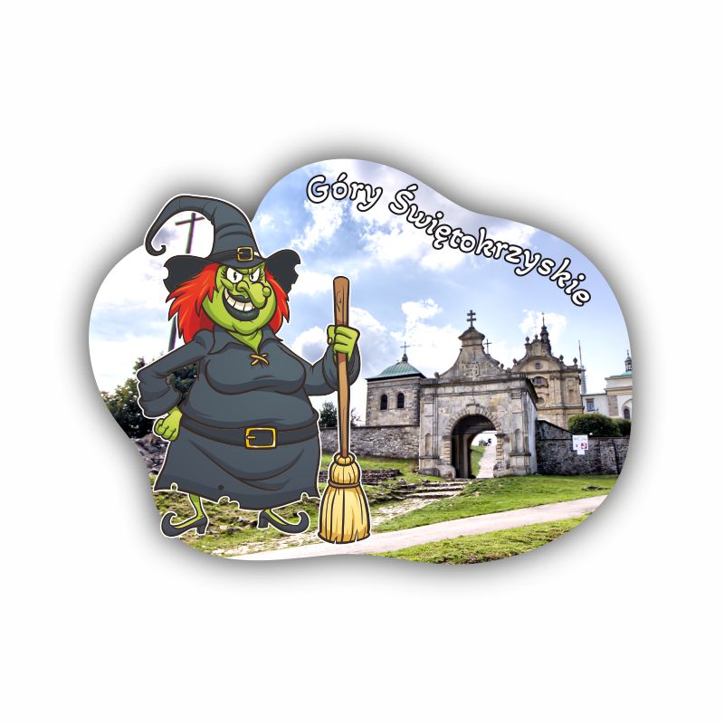 Drewniany magnes czarownica z widoczkiem.