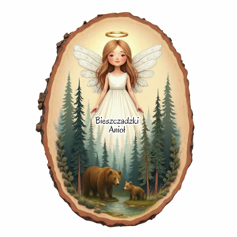 Uroczy drewniany magnes owalny z aniołem i niedźwiedziami to wyjątkowa pamiątka łącząca motyw natury i duchowego spokoju.