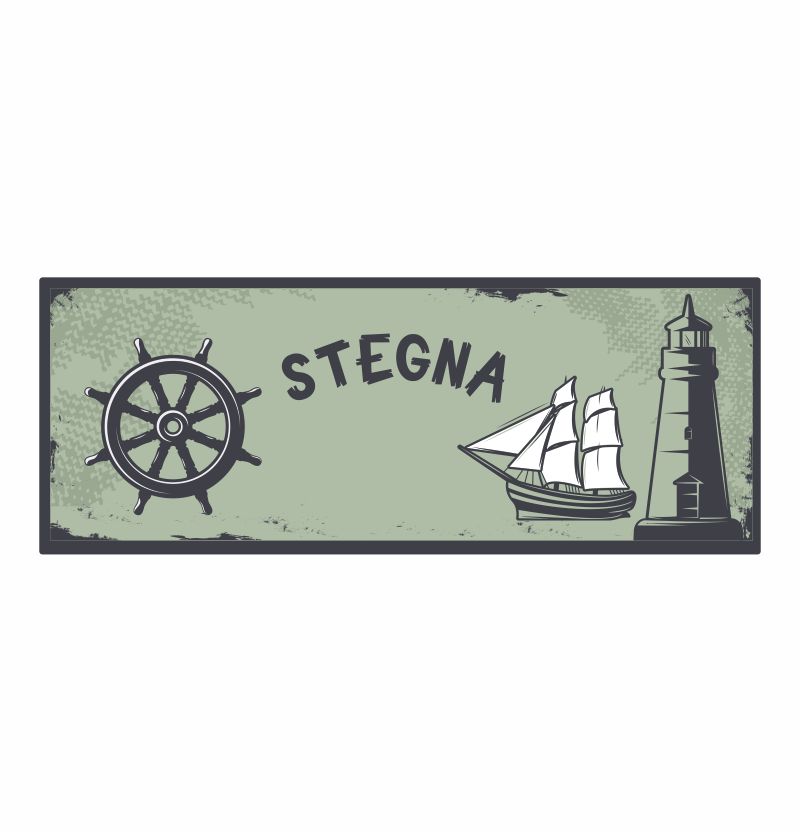 Drewniany magnes na lodówkę Panorama w wersji Vintage przedstawiający latarnię morską, duży żaglowiec oraz koło sterowe.