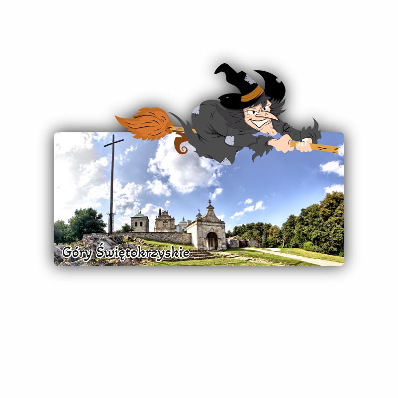 Drewniany magnes czarownica z widoczkiem.