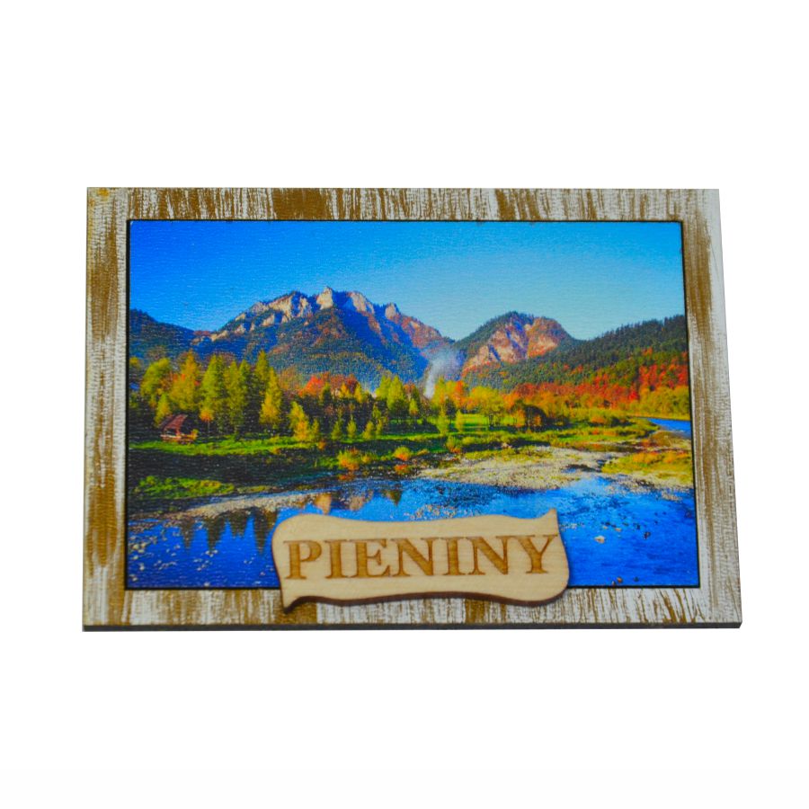 Drewniany magnes z widokiem na Trzy Korony w pozłacanej ramce.