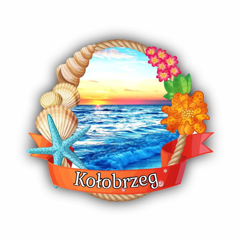Drewniany magnes przedstawiający ozdobną ramkę z widoczkiem oraz ozdobnymi kwiatkami i muszelkami.
