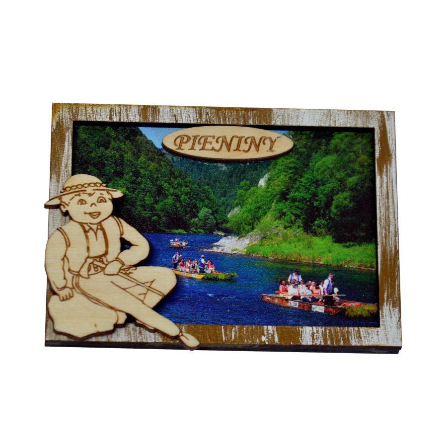 Drewniany magnes z widokiem na przełom Dunajca w pozłacanej ramce oraz motywem górala.