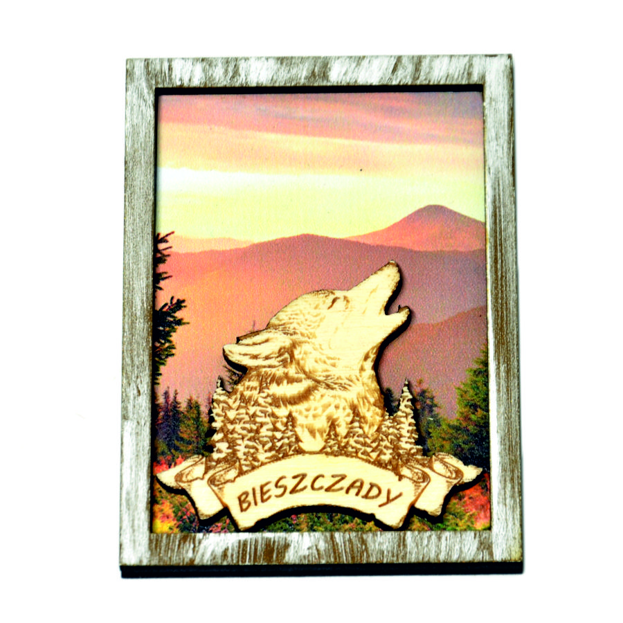 drewniany magnes, pamiątki regionalne producent, pamiątki na bieszczady, producent, śmieszne upominkiMagnes RAMKA Z WILKIEM 1