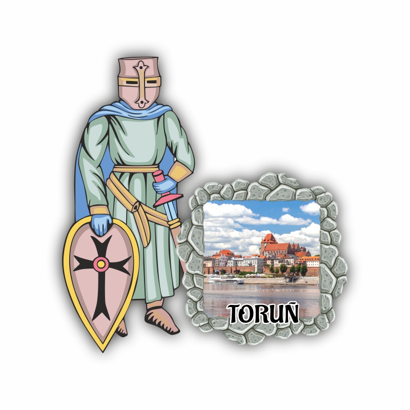 Drewniany magnes rycerz w kolorowych barwach.