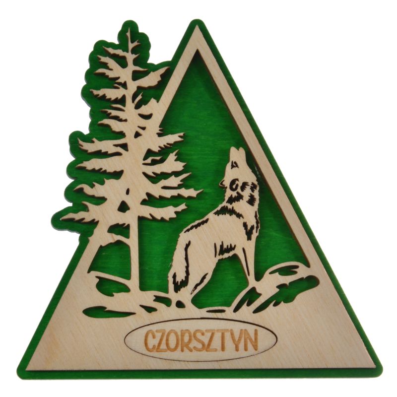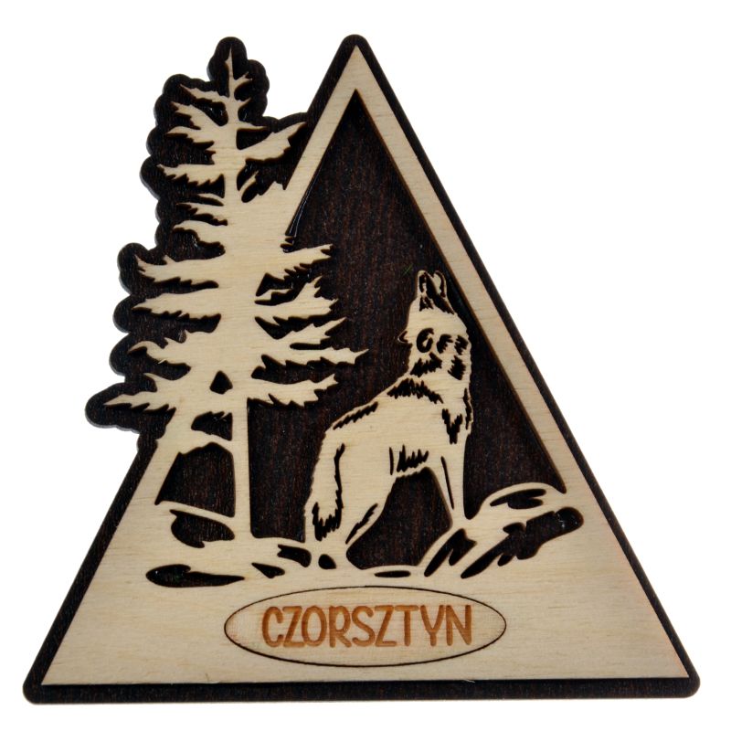 Drewniany magnes z ażurowym wilkiem.