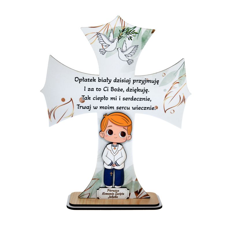 Drewniany krzyż w odcieniach zieleni i złota to wspaniała pamiątka na Pierwszą Komunię Świętą, która zachwyci każde dziecko i jego rodziców. Krzyż jest ozdobiony delikatną i subtelna grafiką, która dodaje mu uroku i piękna. Odcienie zieleni nadają mu dodatkowo delikatności i oryginalności, idealnie pasuje do tej wyjątkowej okazji. Krzyż jest idealnym elementem dekoracyjnym, który można umieścić w pokoju dziecka, dzięki czemu przypomni mu o tym ważnym dniu w jego życiu. Ten piękny drewniany krzyż to wspaniała pamiątka, która będzie przypominała o Pierwszej Komunii Świętej przez wiele lat. Drewniany krzyż to piękna i spersonalizowana pamiątka na Pierwszą Komunię Świętą, która będzie przypominała o tym wyjątkowym dniu w życiu dziecka. To idealny prezent dla rodziców, dziadków i bliskich, którzy chcą podarować dziecku coś wyjątkowego i osobistego. Rozmiar krzyża to około 22 x 20 cm Standardowy napis to "Pamiątka Pierwszej Komunii Świętej" |