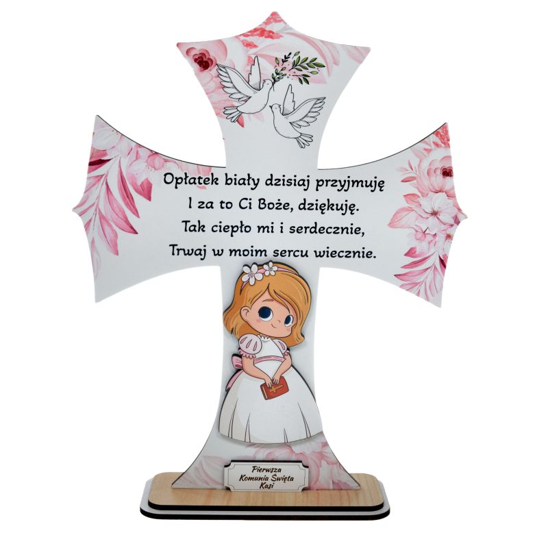 Drewniany krzyż w odcieniach różu to wspaniała pamiątka na Pierwszą Komunię Świętą, która zachwyci każde dziecko i jego rodziców. Krzyż jest ozdobiony delikatną i subtelna grafiką, która dodaje mu uroku i piękna. Odcienie różu nadają mu dodatkowo delikatności i kobiecego uroku, co idealnie pasuje do tej wyjątkowej okazji. Krzyż jest idealnym elementem dekoracyjnym, który można umieścić w pokoju dziecka, dzięki czemu przypomni mu o tym ważnym dniu w jego życiu. Ten piękny drewniany krzyż to wspaniała pamiątka, która będzie przypominała o Pierwszej Komunii Świętej przez wiele lat. Drewniany krzyż w odcieniach różu to piękna i spersonalizowana pamiątka na Pierwszą Komunię Świętą, która będzie przypominała o tym wyjątkowym dniu w życiu dziecka. To idealny prezent dla rodziców, dziadków i bliskich, którzy chcą podarować dziecku coś wyjątkowego i osobistego. Rozmiar krzyża to około 22 x 20 cm Standardowy napis to "Pamiątka Pierwszej Komunii Świętej" |
