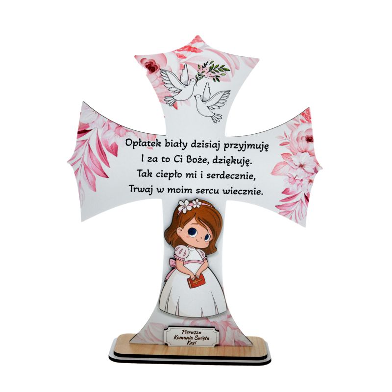 Drewniany krzyż w odcieniach różu to wspaniała pamiątka na Pierwszą Komunię Świętą, która zachwyci każde dziecko i jego rodziców. Krzyż jest ozdobiony delikatną i subtelna grafiką, która dodaje mu uroku i piękna. Odcienie różu nadają mu dodatkowo delikatności i kobiecego uroku, co idealnie pasuje do tej wyjątkowej okazji. Krzyż jest idealnym elementem dekoracyjnym, który można umieścić w pokoju dziecka, dzięki czemu przypomni mu o tym ważnym dniu w jego życiu. Ten piękny drewniany krzyż to wspaniała pamiątka, która będzie przypominała o Pierwszej Komunii Świętej przez wiele lat. Drewniany krzyż w odcieniach różu to piękna i spersonalizowana pamiątka na Pierwszą Komunię Świętą, która będzie przypominała o tym wyjątkowym dniu w życiu dziecka. To idealny prezent dla rodziców, dziadków i bliskich, którzy chcą podarować dziecku coś wyjątkowego i osobistego. Rozmiar krzyża to około 22 x 20 cm Standardowy napis to "Pamiątka Pierwszej Komunii Świętej" |