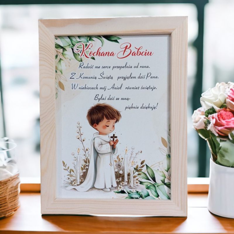 | Drewniany obrazek stanowi piękny prezent oraz podziękowanie dla Babci za udział w uroczystości Pierwszej Komunii Świętej. Ramka wykonana jest z drewna, a na jego powierzchni znajduje się delikatna i kolorowa grafika związana z tematyką religijną. Obrazek posiada specjalny haczyk do zawieszenia, dzięki czemu może być umieszczony na ścianie lub postawiony na meblu jako ozdoba. Na drewnianym obrazku można umieścić personalizowany podpis, z podziękowaniem dla chrzestnego za opiekę i wychowanie, a także życzenia dla dziewczynki na jej dalszą drogę życiową. Drewniany obrazek z możliwością zawieszenia bądź postawienia, to praktyczny i piękny prezent, który na długo pozostanie w pamięci obdarowanego i będzie stanowił piękną pamiątkę z tego wyjątkowego dnia. Rozmiar Ramki A5 |