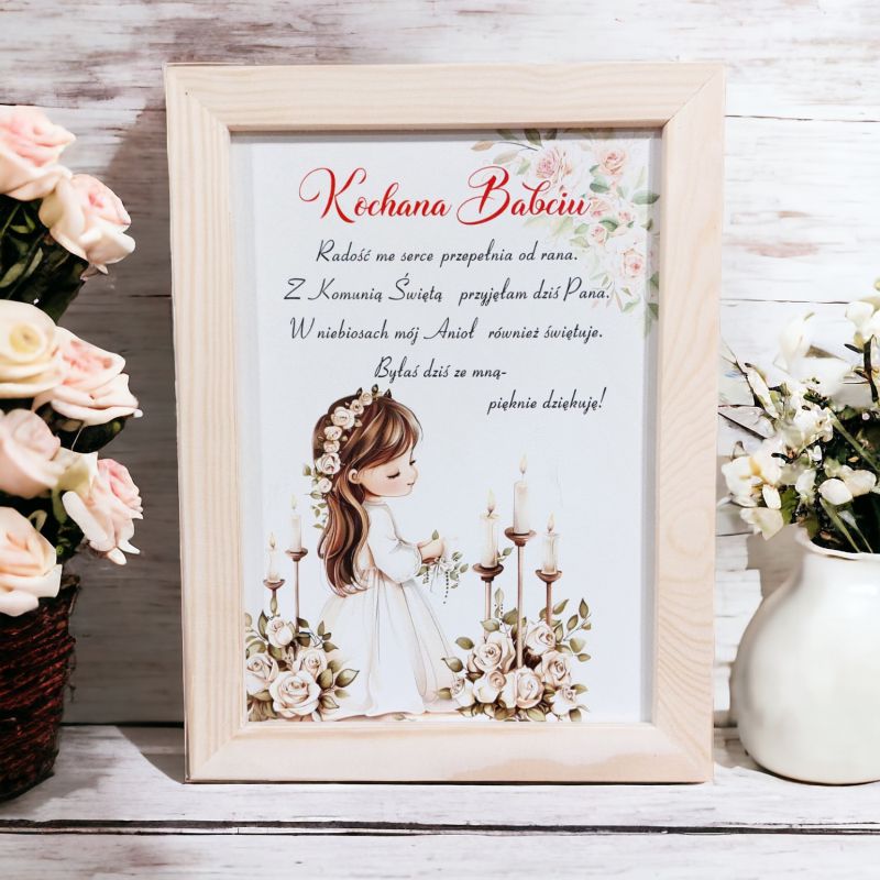 | Drewniany obrazek stanowi piękny prezent oraz podziękowanie dla Babci za udział w uroczystości Pierwszej Komunii Świętej. Ramka wykonana jest z drewna, a na jego powierzchni znajduje się delikatna i kolorowa grafika związana z tematyką religijną. Obrazek posiada specjalny haczyk do zawieszenia, dzięki czemu może być umieszczony na ścianie lub postawiony na meblu jako ozdoba. Na drewnianym obrazku można umieścić personalizowany podpis, z podziękowaniem dla chrzestnego za opiekę i wychowanie, a także życzenia dla dziewczynki na jej dalszą drogę życiową. Drewniany obrazek z możliwością zawieszenia bądź postawienia, to praktyczny i piękny prezent, który na długo pozostanie w pamięci obdarowanego i będzie stanowił piękną pamiątkę z tego wyjątkowego dnia. Rozmiar Ramki A5 |