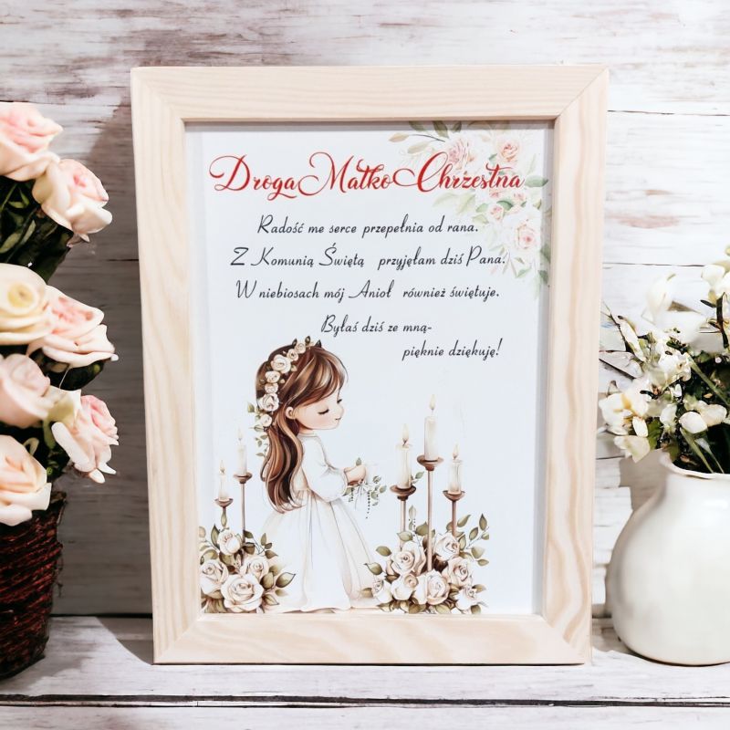 | Drewniany obrazek stanowi piękny prezent oraz podziękowanie dla Matki Chrzestnej za udział w uroczystości Pierwszej Komunii Świętej. Ramka wykonana jest z drewna, a na jego powierzchni znajduje się delikatna i kolorowa grafika związana z tematyką religijną. Obrazek posiada specjalny haczyk do zawieszenia, dzięki czemu może być umieszczony na ścianie lub postawiony na meblu jako ozdoba. Na drewnianym obrazku można umieścić personalizowany podpis, z podziękowaniem dla chrzestnego za opiekę i wychowanie, a także życzenia dla dziewczynki na jej dalszą drogę życiową. Drewniany obrazek z możliwością zawieszenia bądź postawienia, to praktyczny i piękny prezent, który na długo pozostanie w pamięci obdarowanego i będzie stanowił piękną pamiątkę z tego wyjątkowego dnia. Rozmiar Ramki A5 |