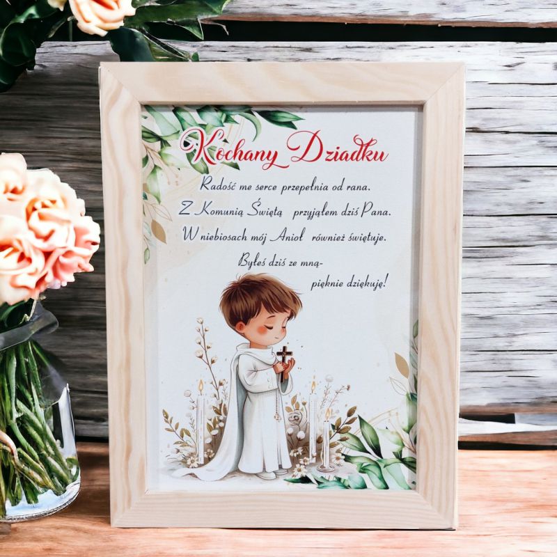 | Drewniany obrazek stanowi piękny prezent oraz podziękowanie dla Dziadka za udział w uroczystości Pierwszej Komunii Świętej. Ramka wykonana jest z drewna, a na jego powierzchni znajduje się delikatna i kolorowa grafika związana z tematyką religijną. Obrazek posiada specjalny haczyk do zawieszenia, dzięki czemu może być umieszczony na ścianie lub postawiony na meblu jako ozdoba. Na drewnianym obrazku można umieścić personalizowany podpis, z podziękowaniem dla chrzestnego za opiekę i wychowanie, a także życzenia dla dziewczynki na jej dalszą drogę życiową. Drewniany obrazek z możliwością zawieszenia bądź postawienia, to praktyczny i piękny prezent, który na długo pozostanie w pamięci obdarowanego i będzie stanowił piękną pamiątkę z tego wyjątkowego dnia. Rozmiar Ramki A5 |