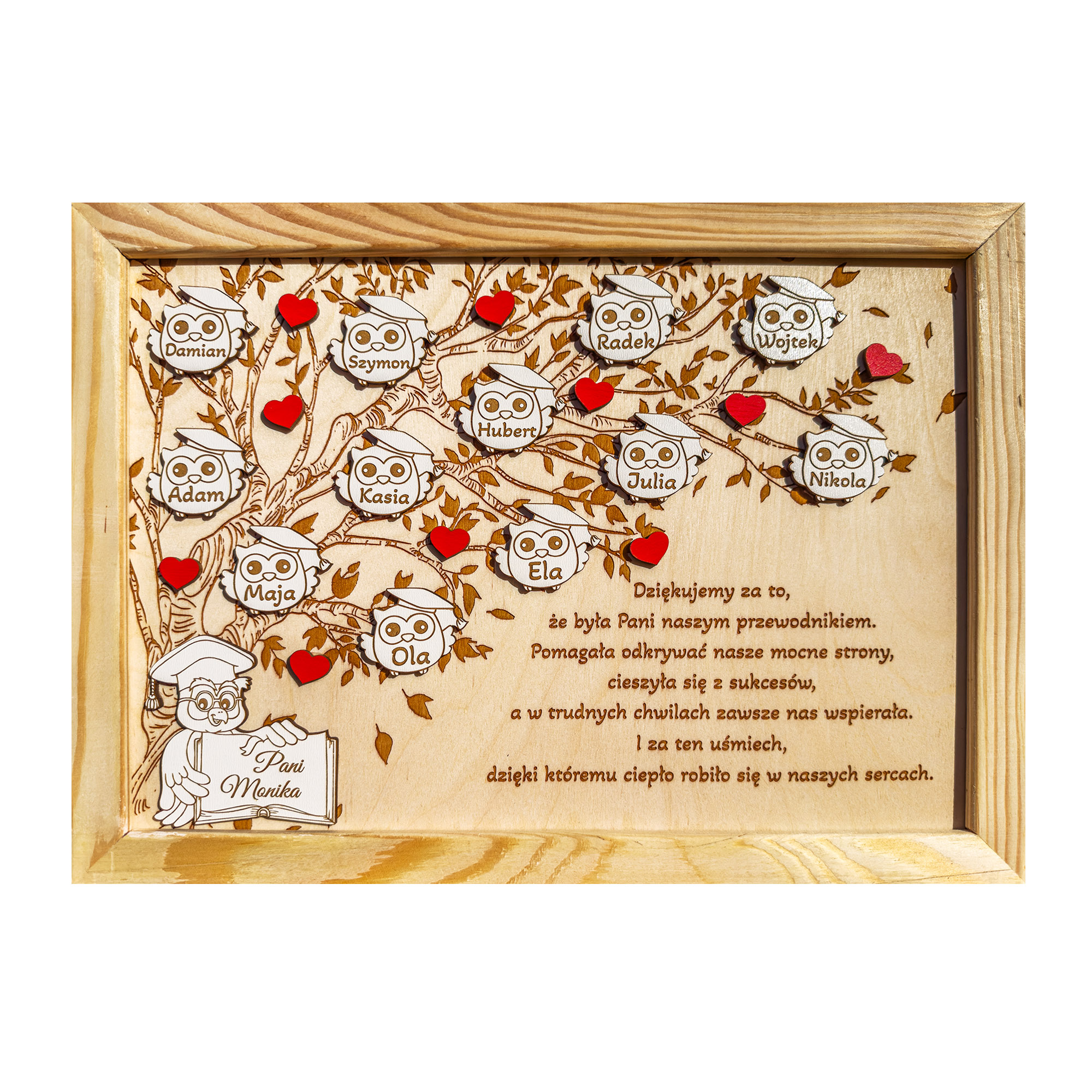 Ramka z grawerowanym drzewem to wyjątkowy i personalizowany prezent dla nauczyciela, który zachwyci swoją symboliką i starannością wykonania. Centralnym elementem ramki jest drzewo, misternie grawerowane na tle, na którym zostały umieszczone białe sowy – symbol mądrości – z imionami uczniów, tworząc piękną pamiątkę wspólnej nauki. U dołu ramki znajduje się większa sowa, trzymająca książkę, na której widnieje imię nauczyciela, co podkreśla jego rolę jako przewodnika i opiekuna wiedzy. Ten elegancki i sentymentalny prezent to doskonały sposób, by podziękować nauczycielowi za trud włożony w edukację.
