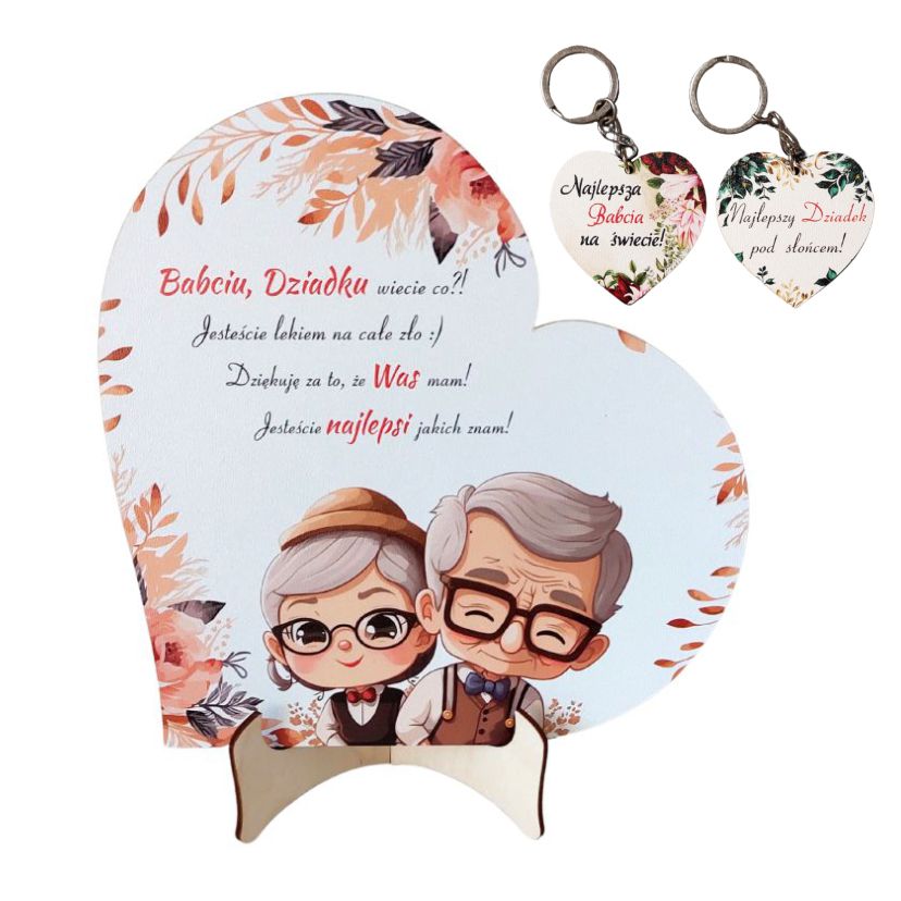 Serce dla Babci i Dziadka na podstawce + 2 breloki - ZESTAW