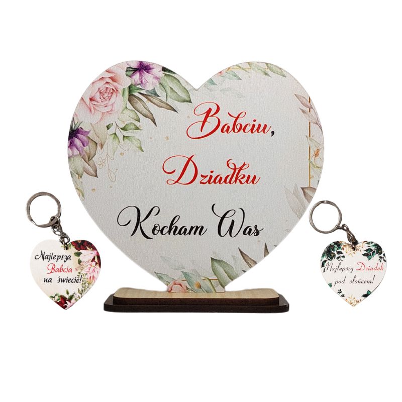 To niezwykłe połączenie serca na podstawce z napisem "Babciu, Dziadku Kocham Was" i breloczków sprawia, że prezent ten nabiera osobistego charakteru i staje się wyjątkowym wyrazem miłości i szacunku.
