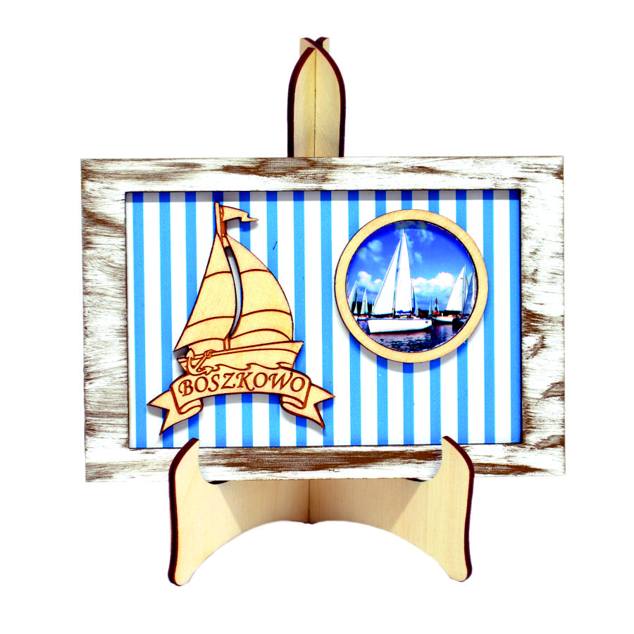 Model ten składa się z drewnianej sztalugi, na którym to umieszczona została ramka w kolorze białym, z efektownie wykonaną, złotą przecierką. Wewnątrz tłem są biało - błękitne, pionowe paski, na których to umieszczona została żaglówka, jak również i koło. Na żaglówce można wygrawerować napis miejscowości, jaki tylko chcemy, w kole zaś zdjęcie z miejsca, które z daną miejscowością nam się kojarzy.