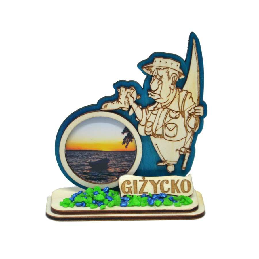 Strona główna » Pamiątki drewniane » Z podstawką » Wędkarz z butem i widoczkiem na podstawce